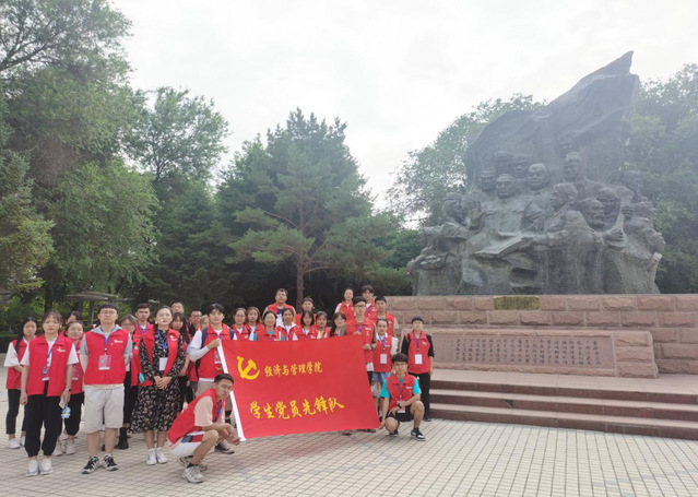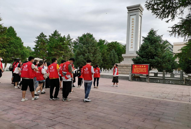 上午十点钟,全体队员到达周恩来总理纪念馆。进入纪念馆后,大家首先参观的是全国唯一一座周恩来总理纪念碑,其正面为“敬爱的周恩来总理永垂不朽”十二个铜铸贴金大字,碑体用钢筋混凝土浇注而成,总高12.8米;碑身呈方柱体,高7.8米,象征周总理享年78岁;碑文高6.7米,象征周总理来此视察时67岁。碑身由大理石贴面,正面为“敬爱的周恩来总理永垂不朽”十二个黄铜镀金大字,背面为碑记,两侧镌刻周总理为军垦战士的题词“高举毛泽东思想的胜利红旗,备战防边,生产建设,民族团结,艰苦奋斗,努力革命,奋勇前进。”
